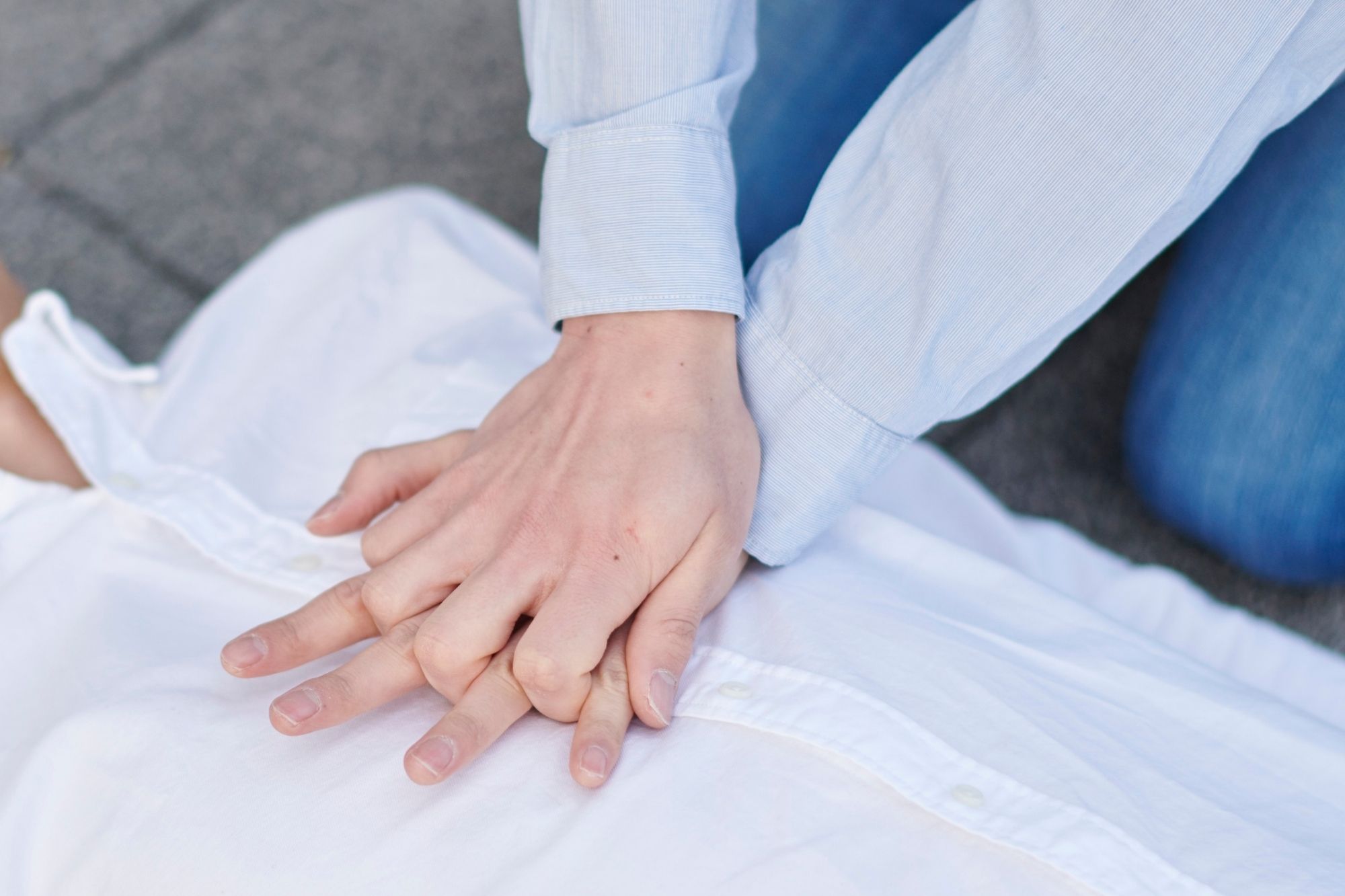 Τοποθετήστε τα χέρια σας στο κέντρο του θώρακα, το ένα πάνω στο άλλο. Πιέστε δυνατά και γρήγορα, με ρυθμό περίπου 100–120 συμπιέσεις το λεπτό (όσο το «Stayin’ Alive»). Το βάθος πρέπει να είναι περίπου 5 εκατοστά σε ενήλικα.